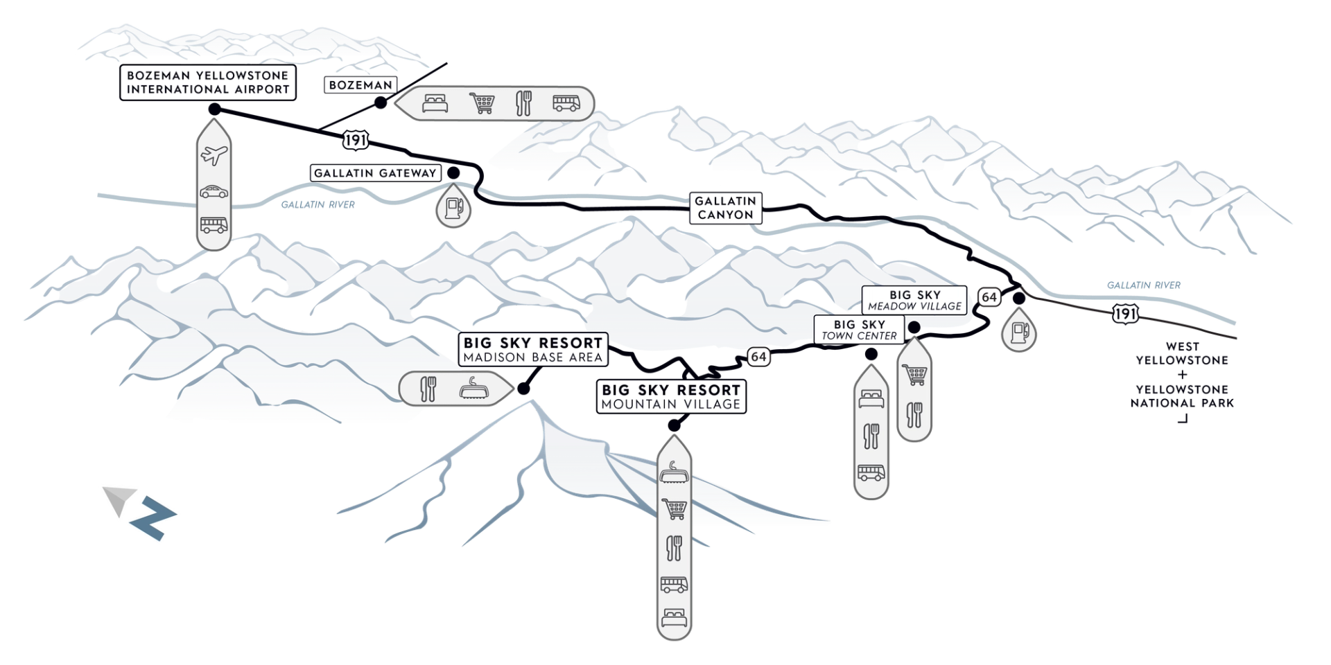 Map showing Big Sky Resort location in relation to the town of Big Sky and Bozeman